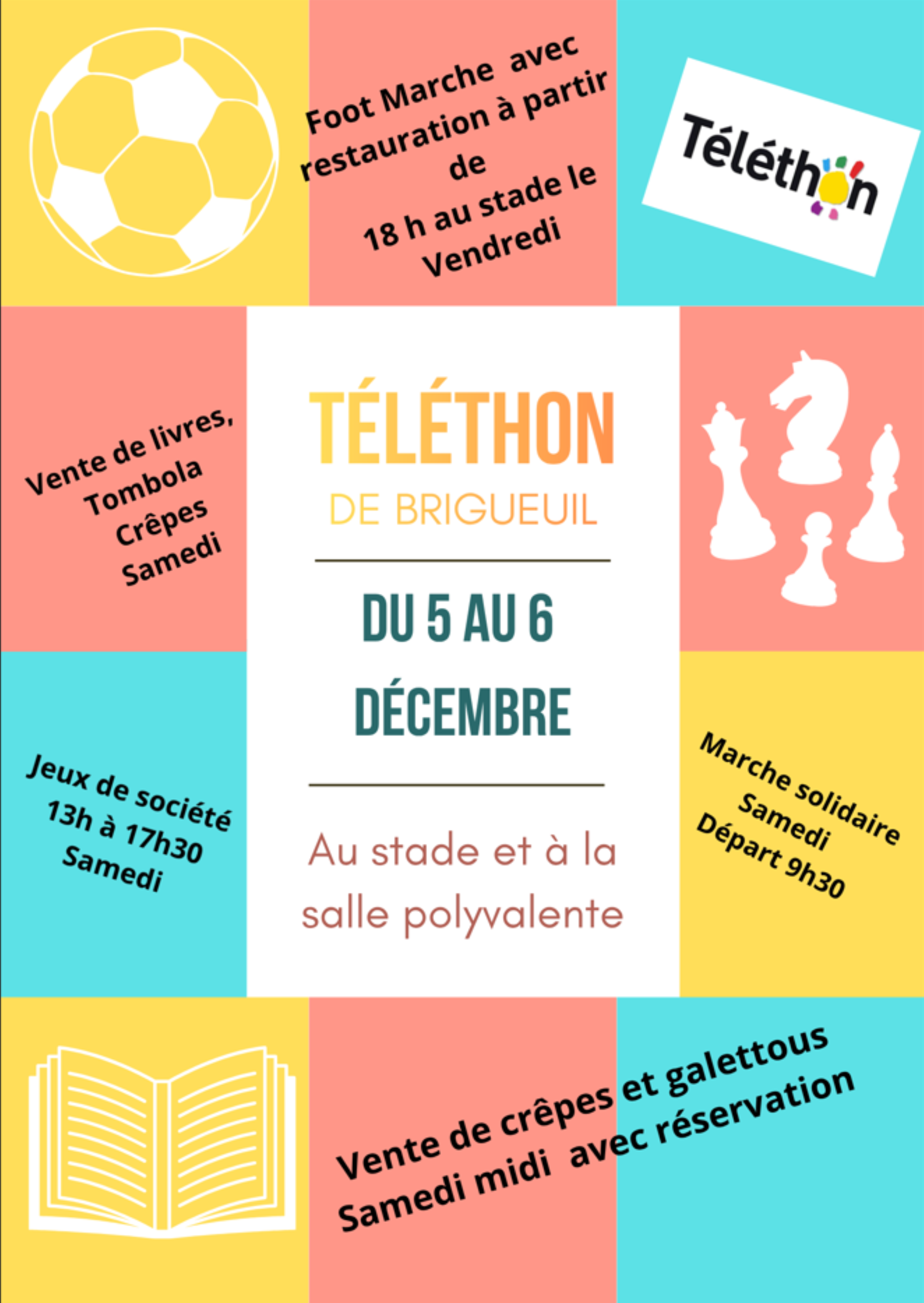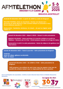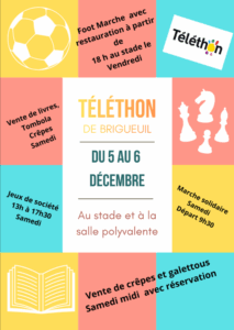 Samedi 06 décembre 2025 – Toute la journée – Salle polyvalente de Brigueuil : Tombolas, ventes de crêpes, gâteaux sucrés/salés, café, vin chaud.