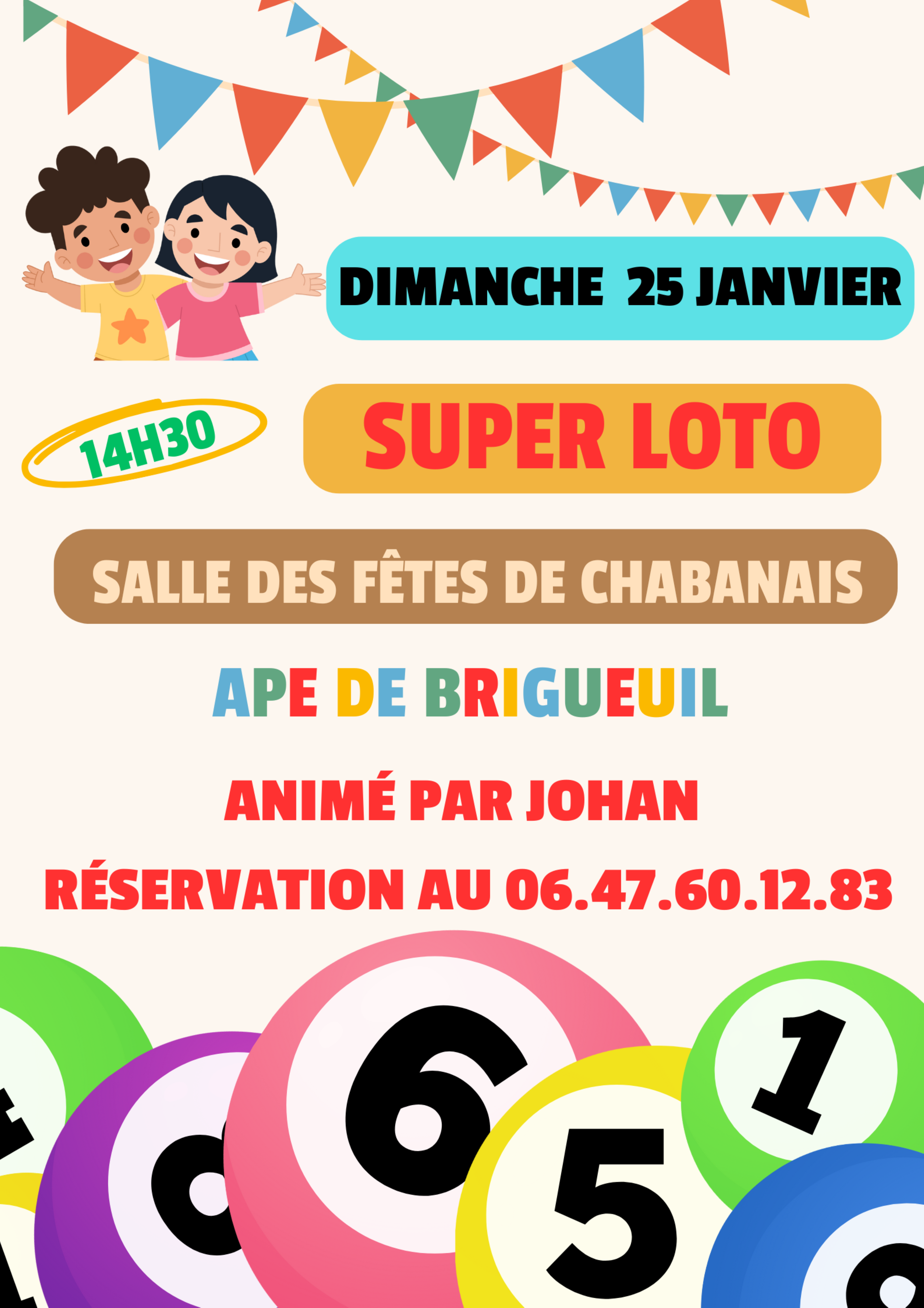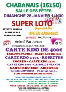 L’Association des Parents d’élèves de Brigueuil organise un SUPER LOTO animé par Johan le dimanche 25 janvier à 14h30 à la salle des fêtes de Chabanais .