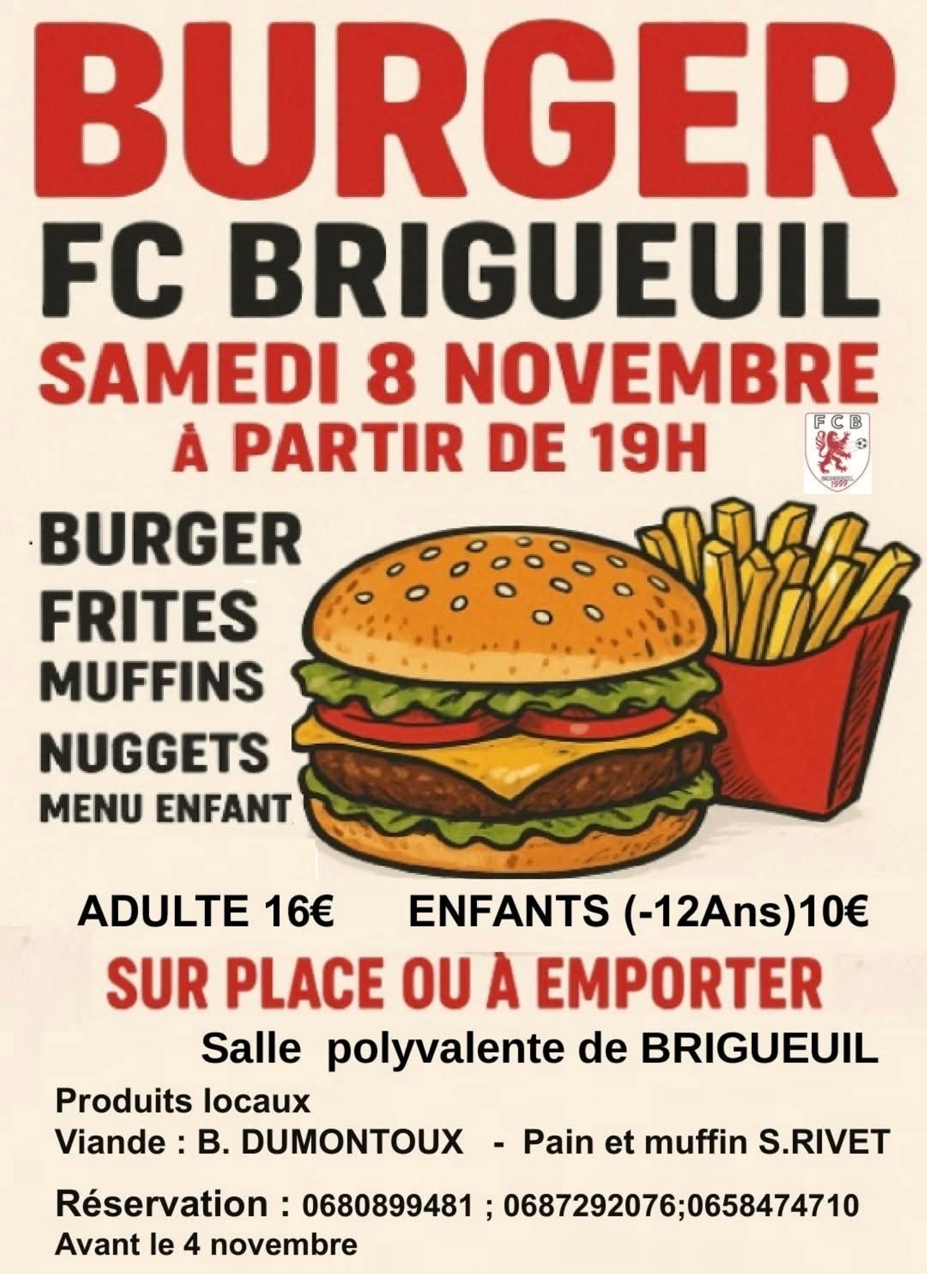 LE FC BRIGUEUIL organise le samedi 08 novembre 2025 à partir de 19h00, à la salle polyvalente de Brigueuil, une soirée BURGER.